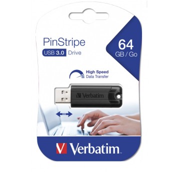 Stylowa, chowana konstrukcja „PinStripe” Interfejs High Speed USB 3.0 Pojemność: 64 GB Otwór na kółko do kluczy 2-letnia ograniczona gwarancja firmy Verbatim