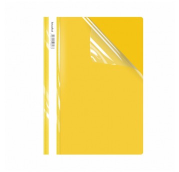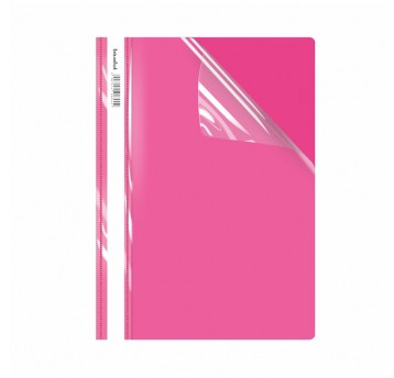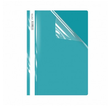 Skoroszyt wykonany z ekologicznej twardej folii, przód przezroczysty, tył kolorowy, wewnątrz klasyczny mechanizm z wąsem i listwą skutecznie zabezpieczający wpiętą zawartość, na bocznej krawędzi wymienny, papierowy pasek do opisu. W opk.10 sztuk.
