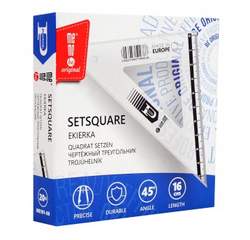 W zestawie 2 standardowe przezroczyste ekierki 16 cm 45/60 stopni, kątomierz 10 cm/180 stopni oraz linijka 16 cm.Elementy zestawu posiadają trwałą nieścieralną podziałkę i zaokrąglone rogi dla bezpieczeństwa użytkownika.
