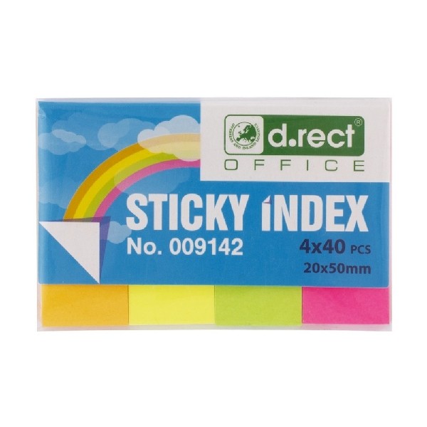Praktyczne zakładki indeksujące przeznaczone do zaznaczania stron w dokumentach, książkach, aktach, katalogach itp. Dzięki neonowym kolorom umożliwiają znakowanie kolorem różnych kategorii informacji. Zakładki nadają się także do zapisywania krókich informacji, jak np. numeru telefonu czy ceny. Stabilny klej umożliwia wielokrotne przyklejanie i odklejanie zakładki, nie niszcząc powierzchni. Każdy komplet to 4 neonowe kolory po 40 karteczek w tekturowym podajniku. Rozmiar pojedynczej zakładki to: 20 x 50 mm.