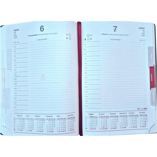 K2-Terminarz ,, Lux”, format A5, układ dzienny, mapy Polski, Czech i Słowacji oraz Europy, kremowy środek, wycięte registry, perforowane narożniki, dwukolorowe miękkie okładki występujące w 6 wersjach oznaczonych symbolami od A do F.
