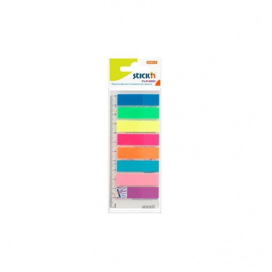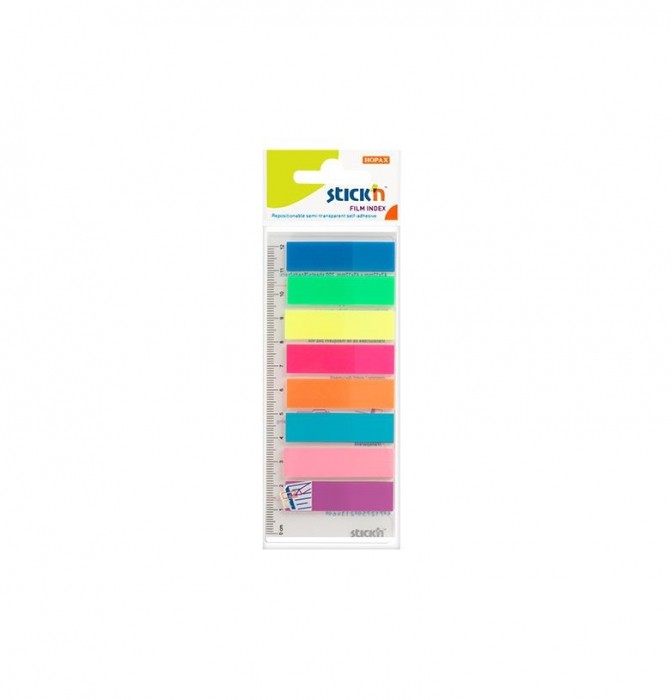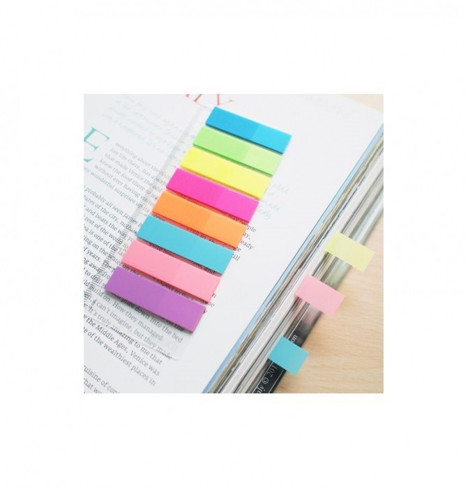 8 bloczków po 25 zakładek o wymiarach 45 × 12 mm. Opakowanie zawiera dodatkowo 12 cm linijkę. Zakładki umożliwiają łatwe zaznaczanie i szybkie odnajdywanie ważnych informacji. Można je wielokrotnie odrywać i przyklejać w innych miejscach. J.sprz. sztuka, opk. zbiorcze 24 sztuki