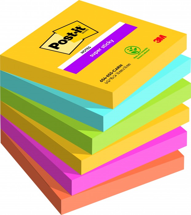 Kolorowe karteczki samoprzylepne Post-it® Super Sticky to innowacyjne rozwiązanie na codzienne zarządzanie zadaniami i priorytetami. Dzięki kolorom świetnie się wyróżniają, dzięki Super Sticky trzymają się w każdym miejscu.