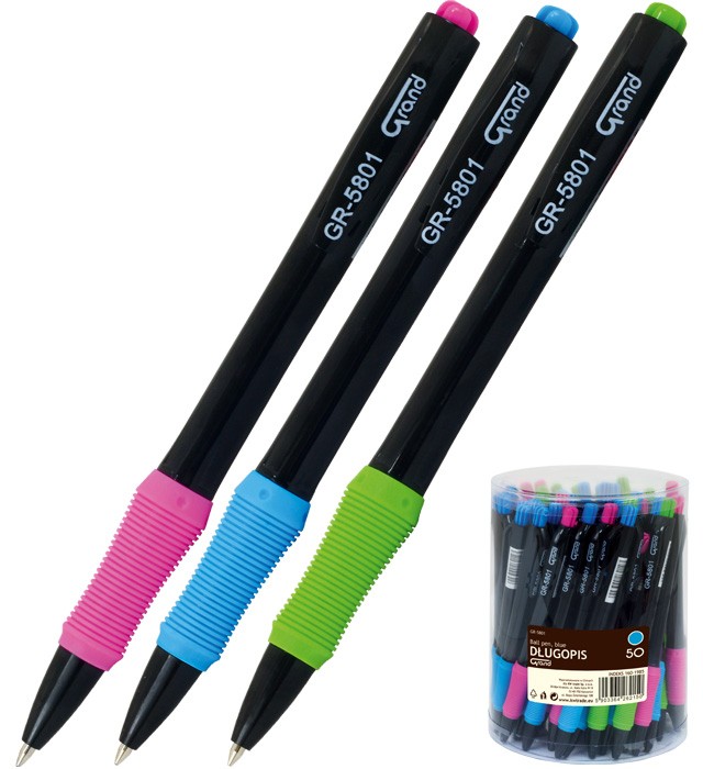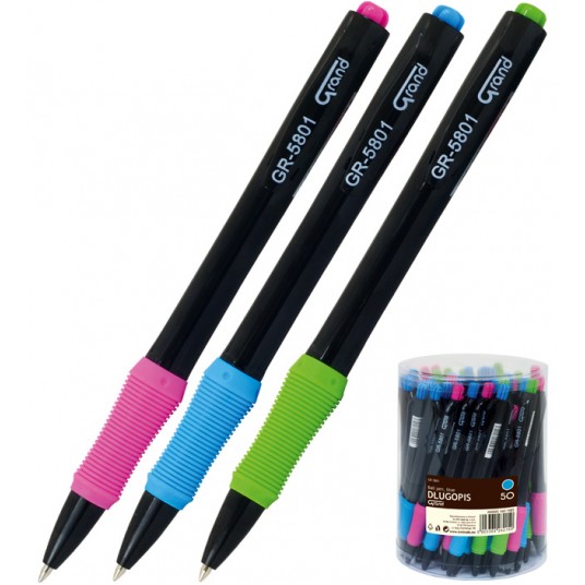 automatyczny z wymiennym wkładem – ergonomiczna obudowa z uchwytem antypoślizgowym – indywidualny kod kreskowy w formie naklejki usuwalnej bez śladu – tusz wodoodporny – długość pisania: 790 m – grubość linii 0,7 mm – niebieski kolor tuszu – opakowanie: tuba 50 szt.